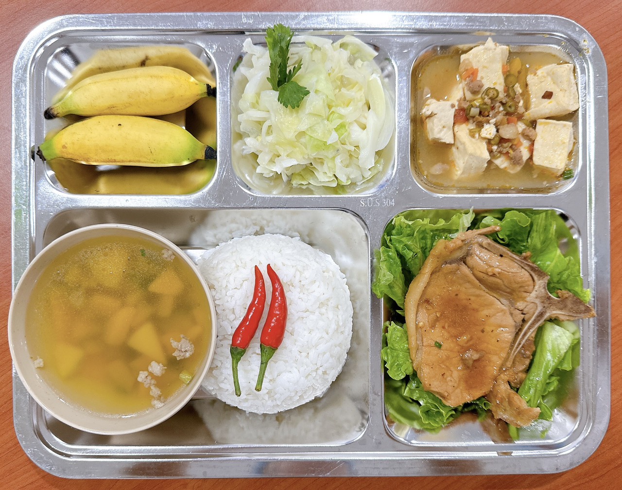 Cơm trắng, gà sốt chua ngọt (thịt gà, cà chua, dứa, ớt chuông), canh rau cải, tráng miệng: chuối.