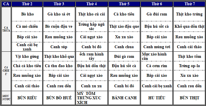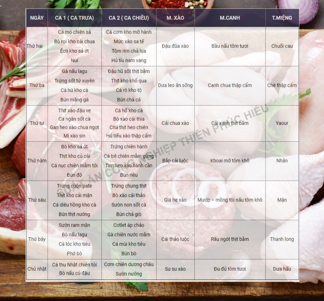 Lưu ý: Đây chỉ là thực đơn gợi ý, có thể điều chỉnh theo mùa và theo khẩu vị của công nhân. Quan trọng là đảm bảo sự đa dạng, cân bằng dinh dưỡng và an toàn vệ sinh thực phẩm.